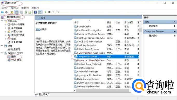 选择"计算机管理→服务和应用程序→服务"文件夹,如图所示。拖动右侧垂直滚动条,鼠标双击"Computer Browser"项。