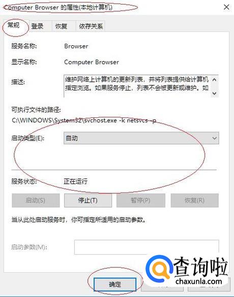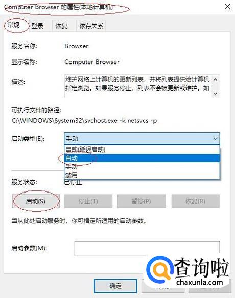 如图所示,弹出"Computer Browser的属性"对话框。选择"常规→启动类型→自动"项,点击"服务状态→启动"按钮。