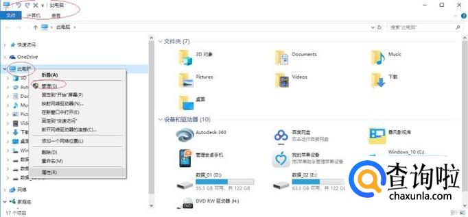 唤出"资源管理器"程序窗口,如图所示。鼠标右击"此电脑"文件夹,弹出快捷菜单选择"管理"项。