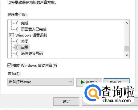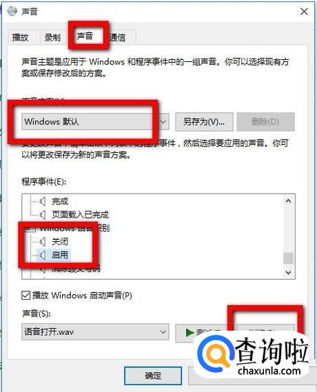 在声音中有一个默认选项,其中的启用和关闭就是电脑的开关机声音,可以点击浏览自行选择。