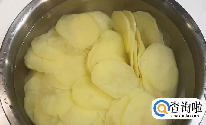 土豆切片,放入冷水中浸泡,洗去表面附着的淀粉,这样土豆会更脆。然后把土豆放入沸水中煮三分钟,千万不能煮太久,煮久了土豆就不脆了。