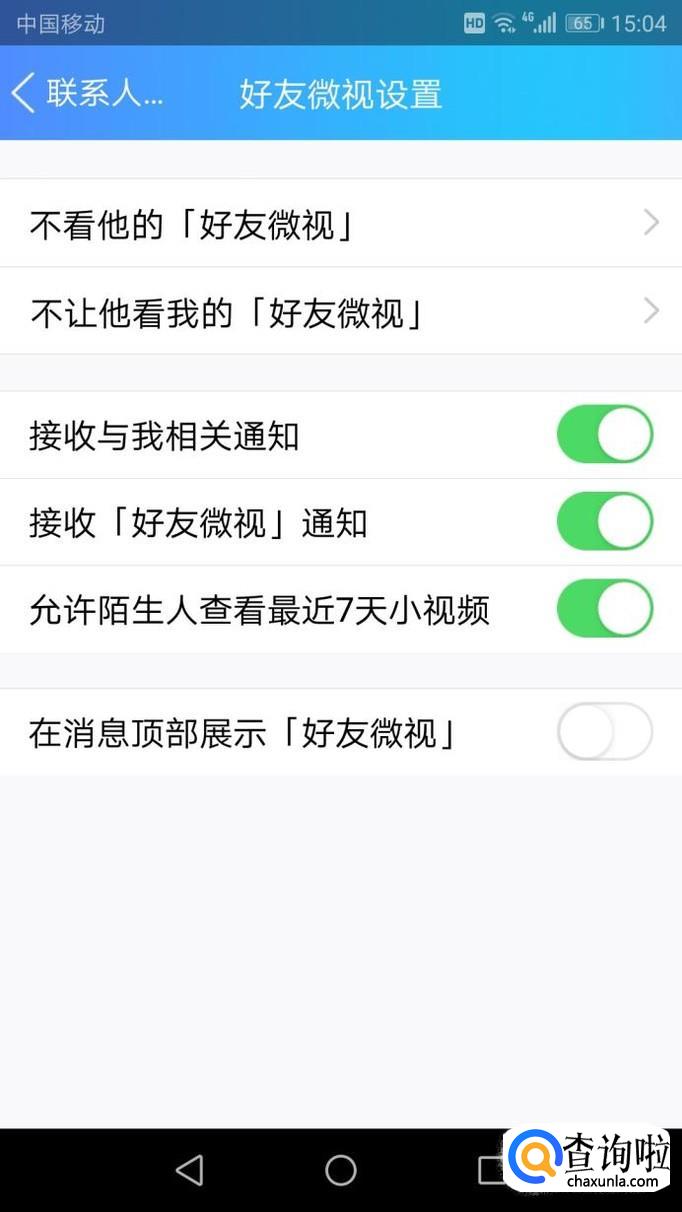 点击最后一个“在消息顶部展示[好友微视]”关闭,就完成了好友微视的关闭,再退出就看不到好友微视了。