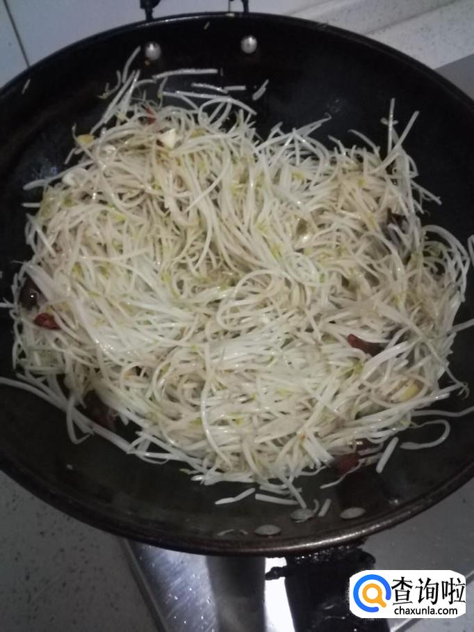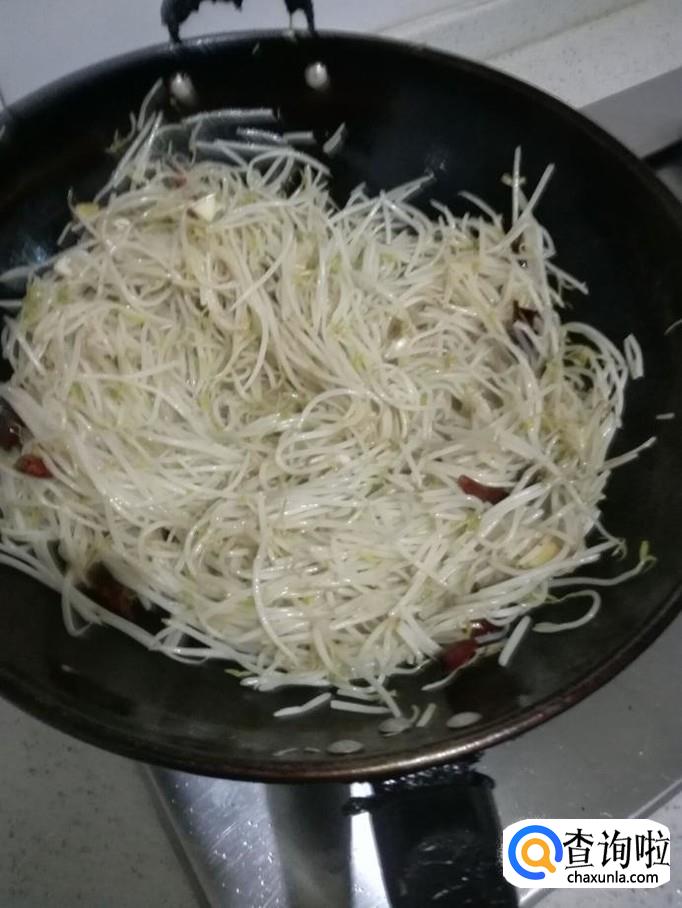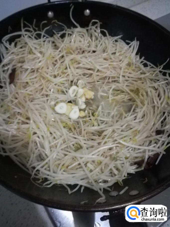 待豆芽炒好后,先用筷子尝尝豆芽是否可以食用了,若觉得豆芽已熟,则转小火,放入姜蒜、盐等作料。