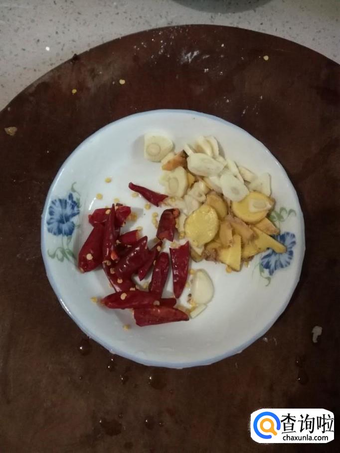 把姜蒜、干海椒洗干净,并把姜蒜切成薄片,干海椒切成小段状装盘备用。