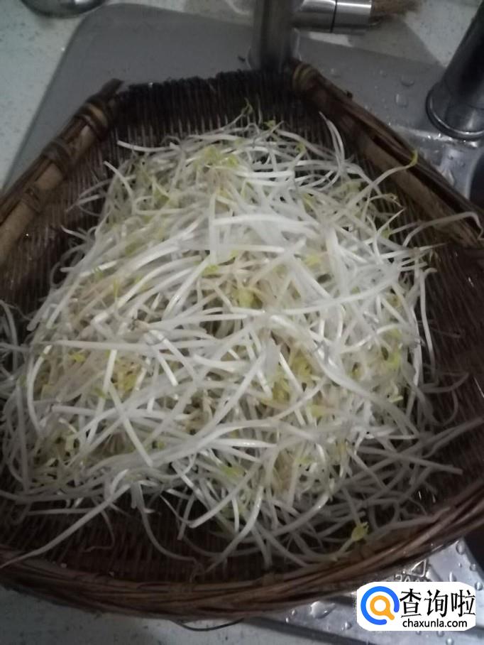 把泡好的绿豆芽用筲箕沥出,放在一边备用。