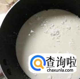 将牛奶糊倒入碗中至装满,用我们的勺子底部将面糊刮平。晾凉后盖上保鲜膜,放冰箱冷藏3小时凝固成型。