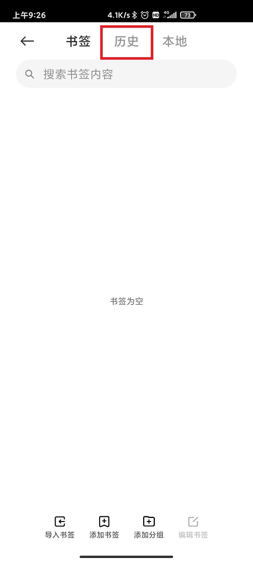 2、在书签界面,我们可以看到自己添加的书签都在这里显示,我们可以看到历史记录,点击它就会进入历史记录界面。