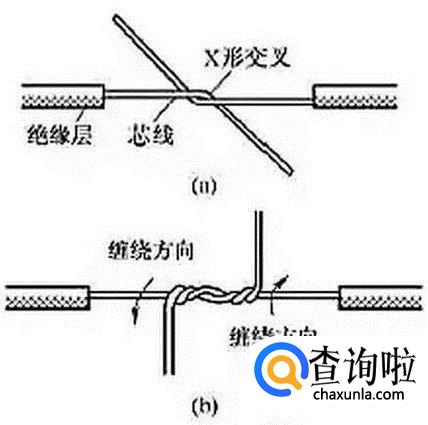 单股铜导线接线,如图所示先将两股铜线x形交叉,然后互相缠绕紧,即可。