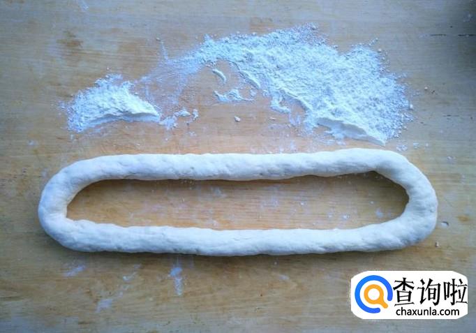 准备好面板,放上少许布面,将醒发好的面团揉成细腻的面团,然后从面团中间开个孔,不断抻揉成面圈。