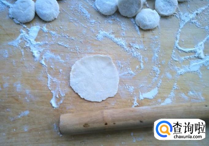 把饺剂子按压成小的圆饼,再用擀面杖把饺子皮擀好。