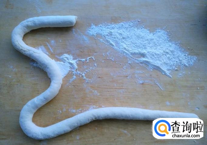 然后将面圈拽断成条状,接着在面板上双手按揉面条使它更圆一些,然后揪成饺剂子。