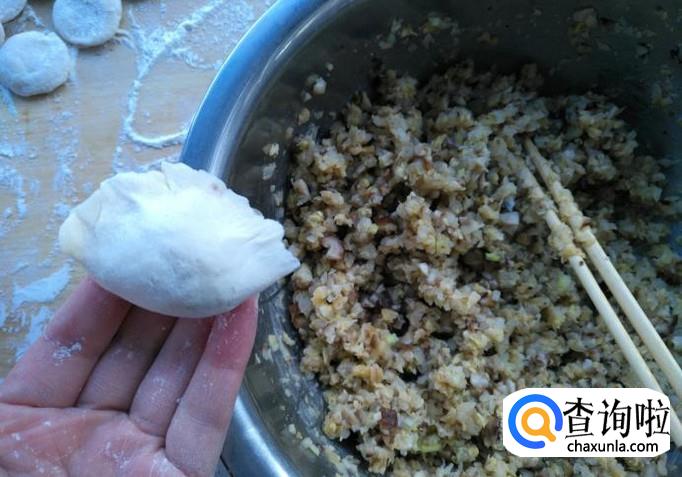 将饺皮放在手掌中,放入馅料,从中间先捏上,再把两边捏上。一个饺子就包好了。