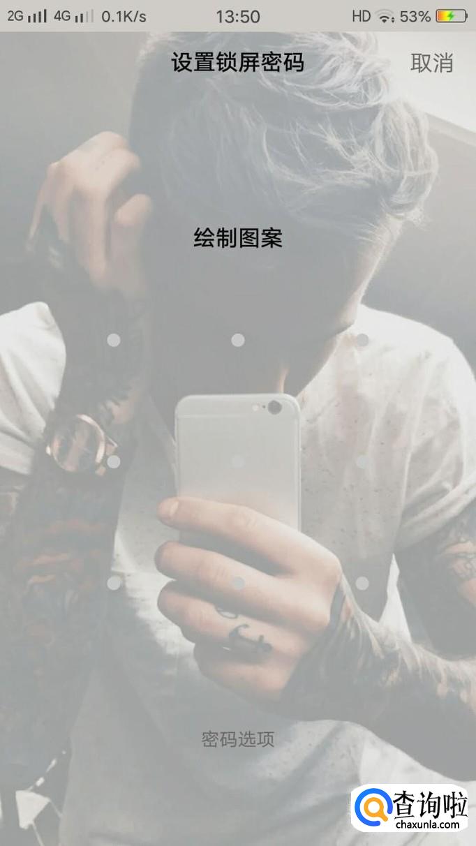 进入之后,点击“密码选项”选择设置“图案密码”,进入之后绘制图案即可,如图所示。