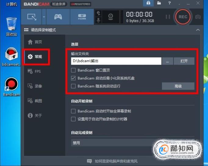 注意在Bandicam界面,点击“常规”选项,设置好录制输出的文件夹,最好设置在除C盘外的其他盘中,勾选“Bandicam 启动后最小化到系统托盘”,这样保持在后台录制游戏