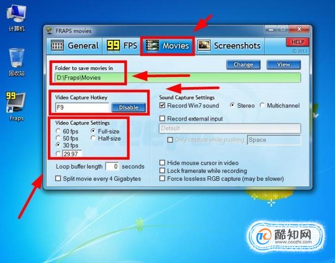 运行fraps,找到“Movies”选项(这里译为视频),设置好视频的输出目录,并且设置好录制热键,和视频帧数
