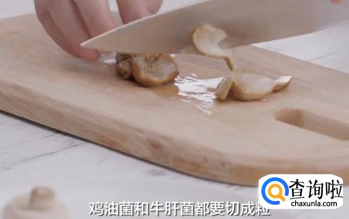 鸡油菌和牛肝菌都切成粒。