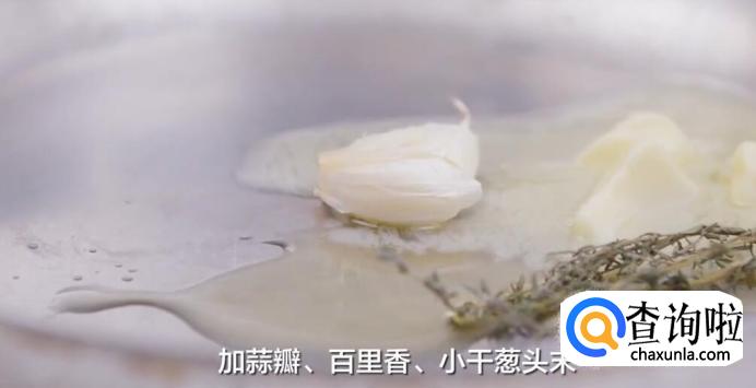 蒜瓣适量、百里香适量、干葱头适量、橄榄油适量、黄油适量、蛋液适量、黑胡椒适量