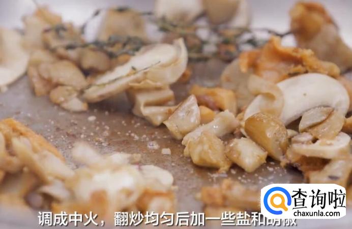 调成中火,翻炒均匀后加一些盐和胡椒。
