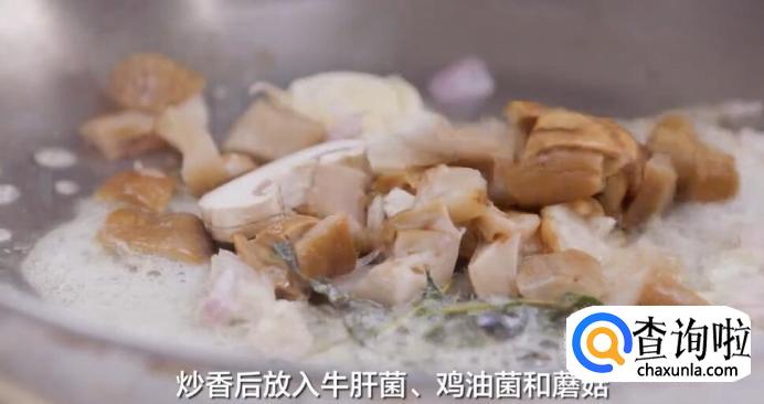 炒香后放入牛肝菌、鸡油菌和蘑菇。