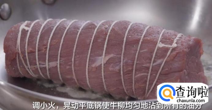 将牛柳放入锅中,调小火,晃动平底锅使牛柳均匀地沾到所有的油分。