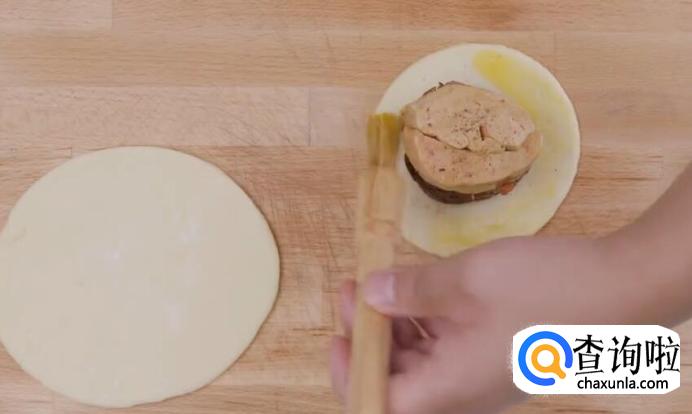 在小酥皮边缘刷上蛋液。