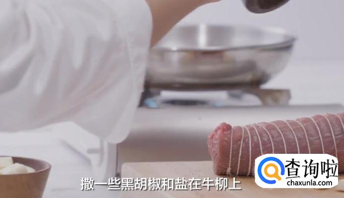 撒一些黑胡椒和盐在牛柳上。