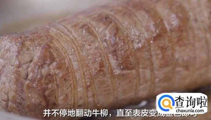 并不停地翻动牛柳,直至表皮变成金色即可。