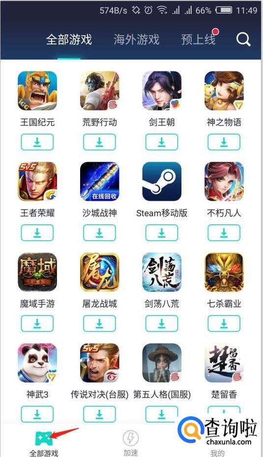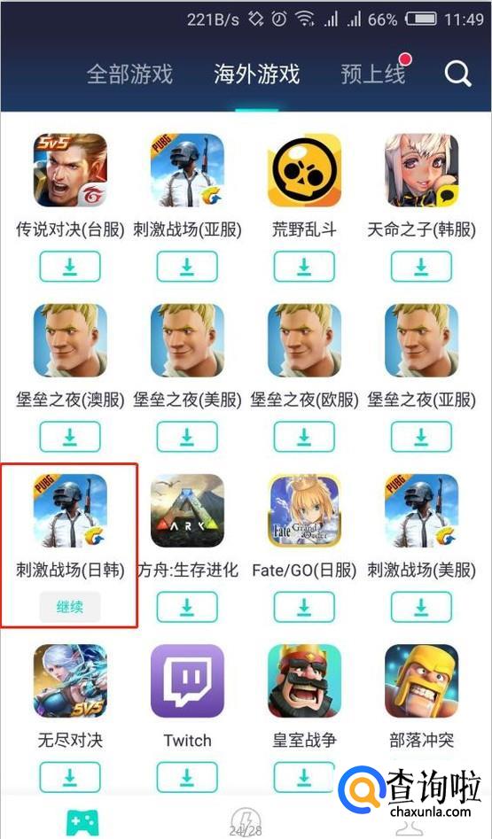 点到全部游戏以后,点开海外游戏,由于刺激战场手游比较火,所以在第一页就可以看到,直接找到刺激战场日服,然后点击下载就好了。