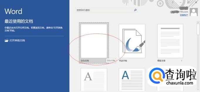 启动Word 2016文字处理应用软件,如图所示点击屏幕右侧新建空白文档。