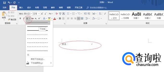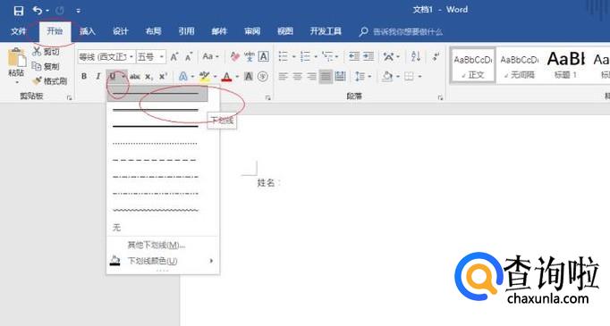 如图所示,选择"开始→字体"功能区。点击"下划线"图标向下箭头,弹出下拉列表选择添加下划线。