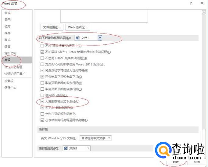 唤出"高级选项"用户界面,如图所示。拖动右侧垂直滚动条,勾选"以下对象的布局选项→为尾部空格添加下划线"复选框。
