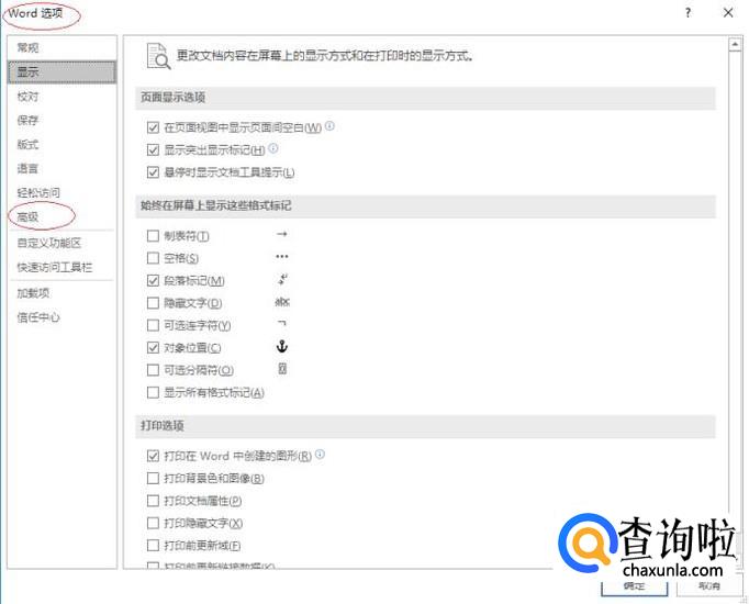 如图所示,弹出"Word 选项"对话框。选择界面左侧"高级"项,下步将排除添加下划线却不显示的故障。