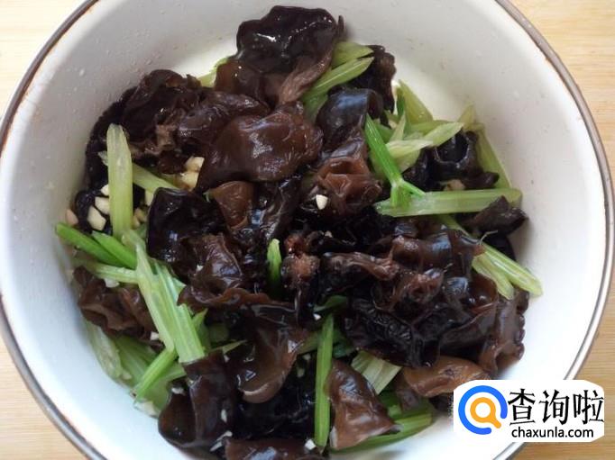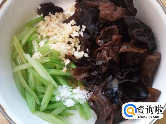 把香芹,木耳,切好的蒜末一起放入碗中,放入盐,味精,白糖,陈醋,拌和均匀。