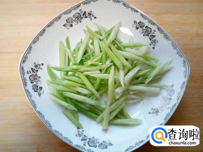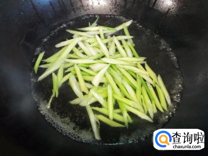 香芹用水焯一下,水开后入锅30秒钟捞出,迅速用冷水过凉,沥干水分。