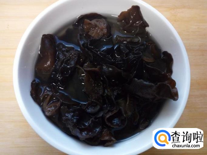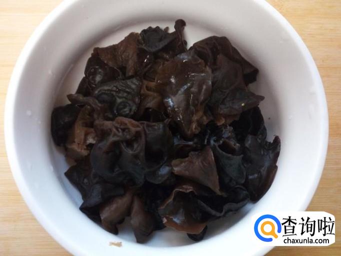 用温水快速泡发木耳。把泡发好的木耳收拾清洗干净,攥干水分。