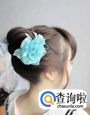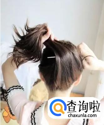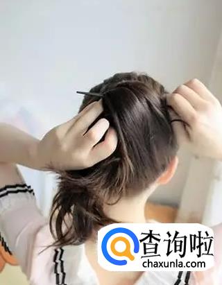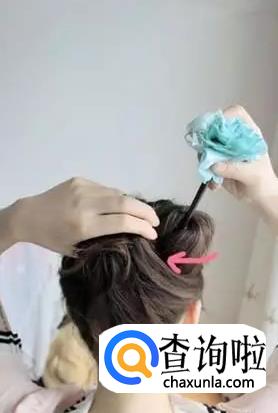 然后拿出今天的主要工具发簪放在马尾的上方。