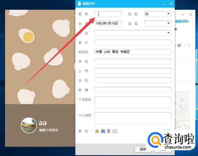然后,进入QQ编辑资料页面。将空白符粘贴到昵称,并点击确定。