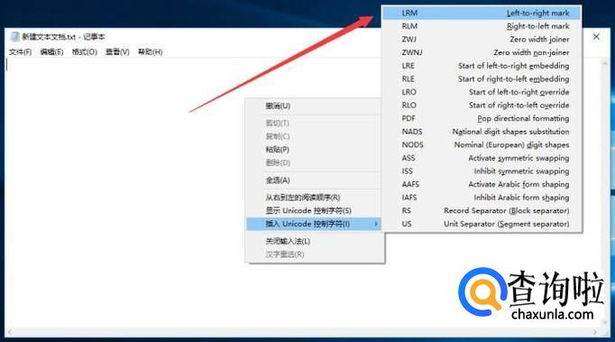 进入记事本后,右键单击,选择“插入Unicode控制字符”>"LRM"。