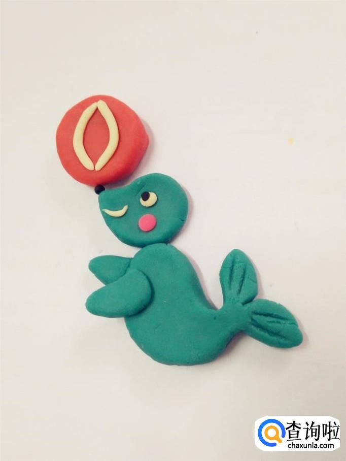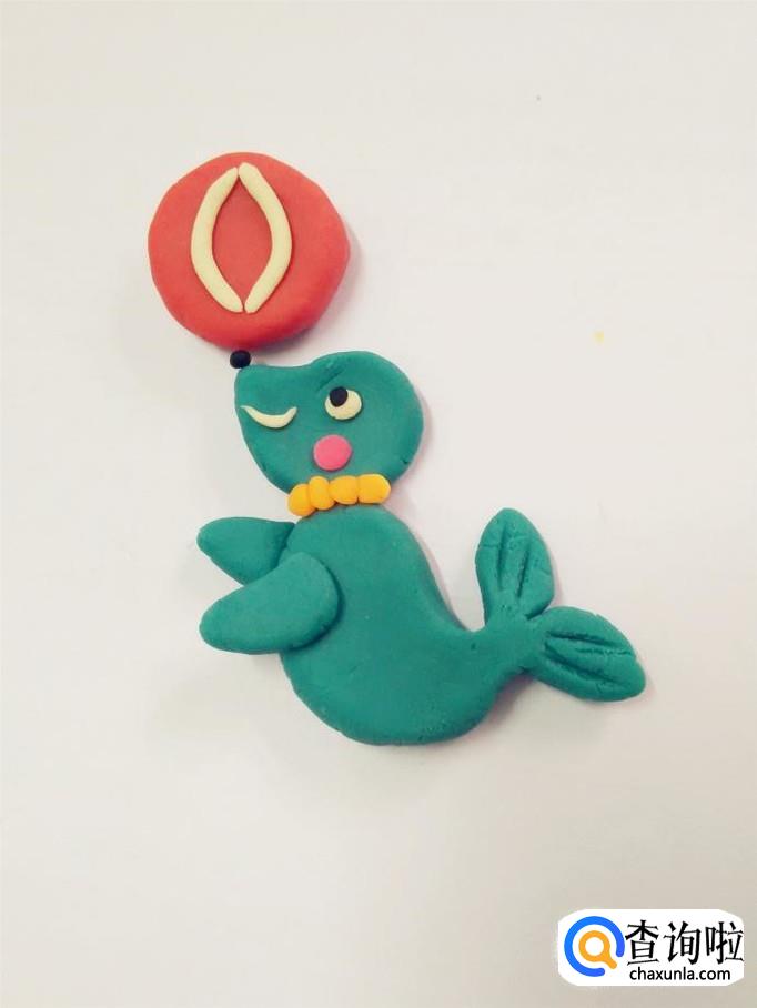 最后用桔黄色团四个小球,连在一起,围在海豹的脖子上,当作花环,小海豹顶球就做完了。