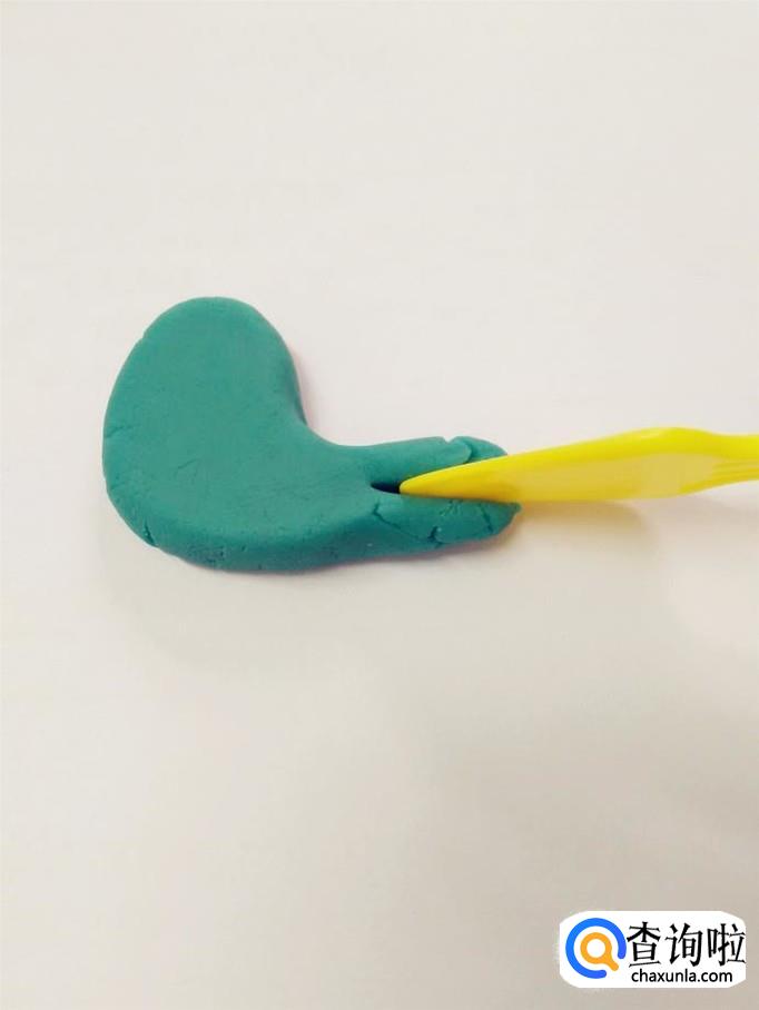 用一大块蓝色,捏成哨子形状,当它的身体,再用小刀在右边切一刀。