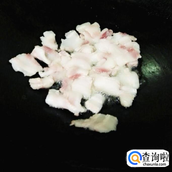 锅烧七成热,放少量花生油,先炒五花肉,中火炒出油就好。