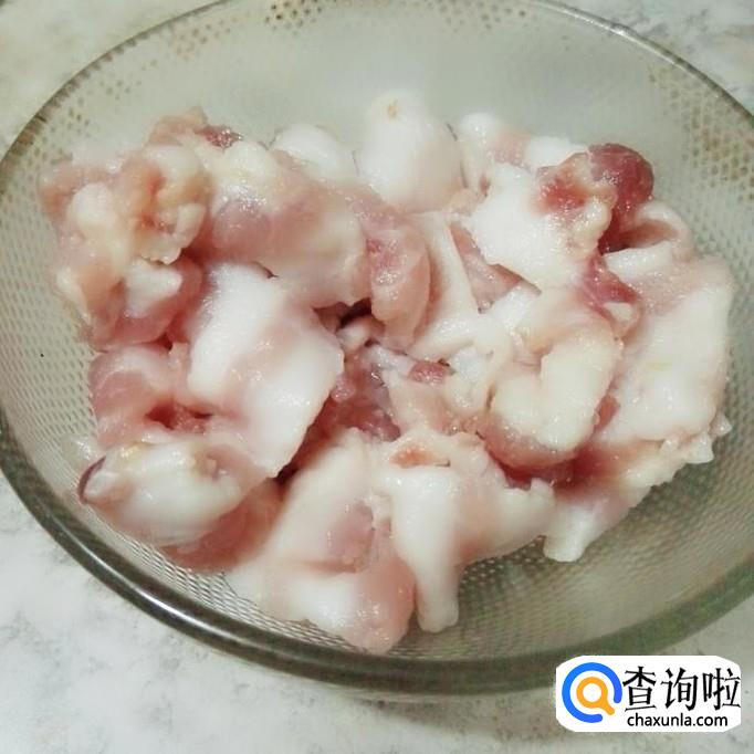 先把五花肉洗干净,再切成薄片,因为五花肉比较多油,越切得薄越好,油越容易煎出。