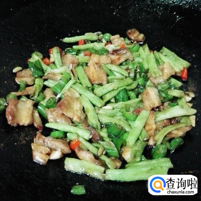 炒至豆角皮起皱了,就把所有配料放下去,跟着放一小勺盐,再翻炒。