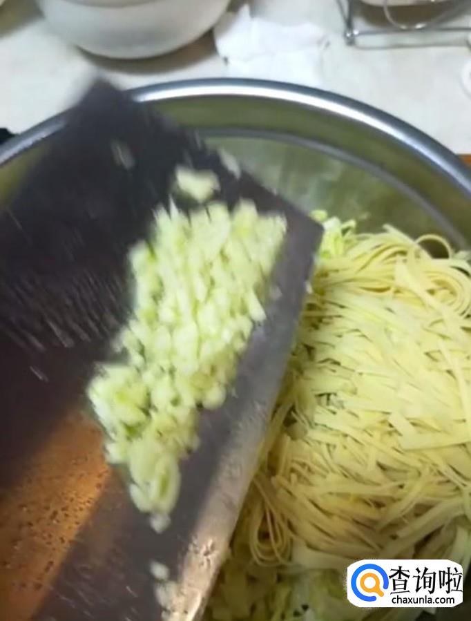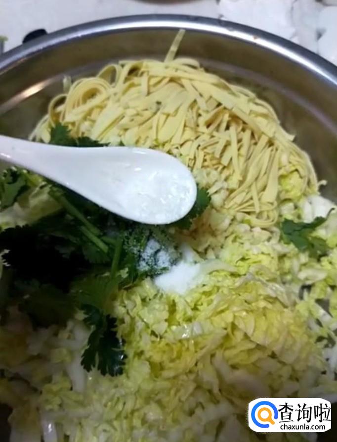 接着我们将切好的白菜丝与豆腐皮丝放入一个盆中,加入适量的蒜末