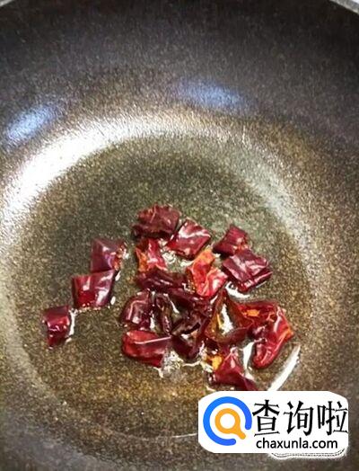 接着我们在锅中放入少许油,油热下入干辣椒,爆香一下关火