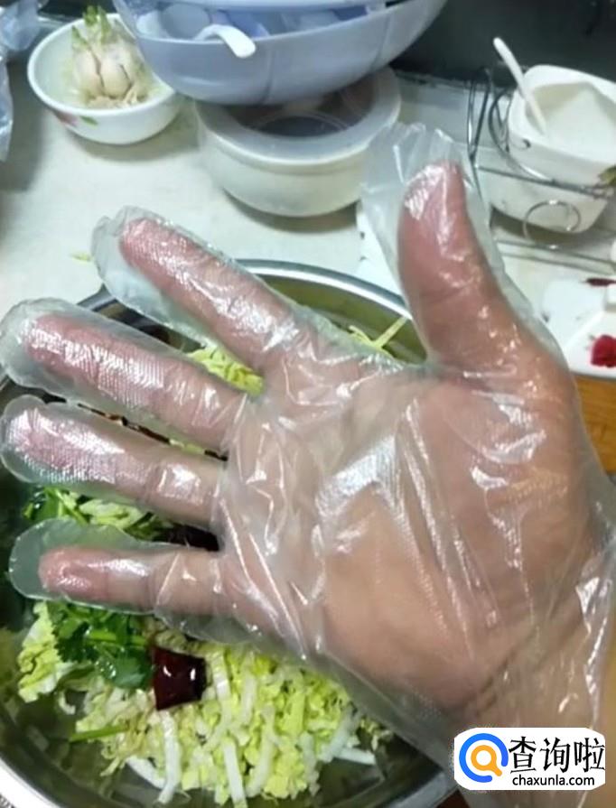 然后我们将热油浇在白菜上面,带上手套,抓拌均匀