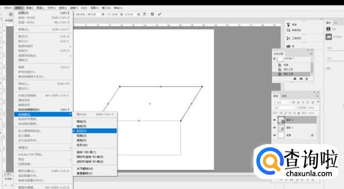 选择工具栏中的 编辑> 变换路径 >斜切,鼠标选中右上锚点,向右拖拽,选中左上锚点,同样向右拖拽,与之水平即可,效果如下图