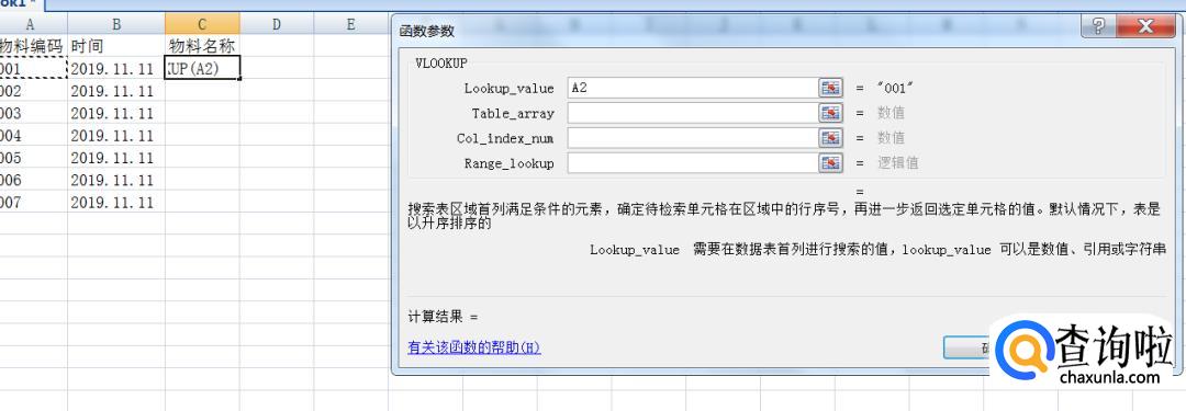 我们先选择第一个空白方框,由于是我们两个表【物料编码】数据进行匹配字段进行匹配,所以,相应的这行,我们输入的第一个参数为【A2】,表示A2列的值。