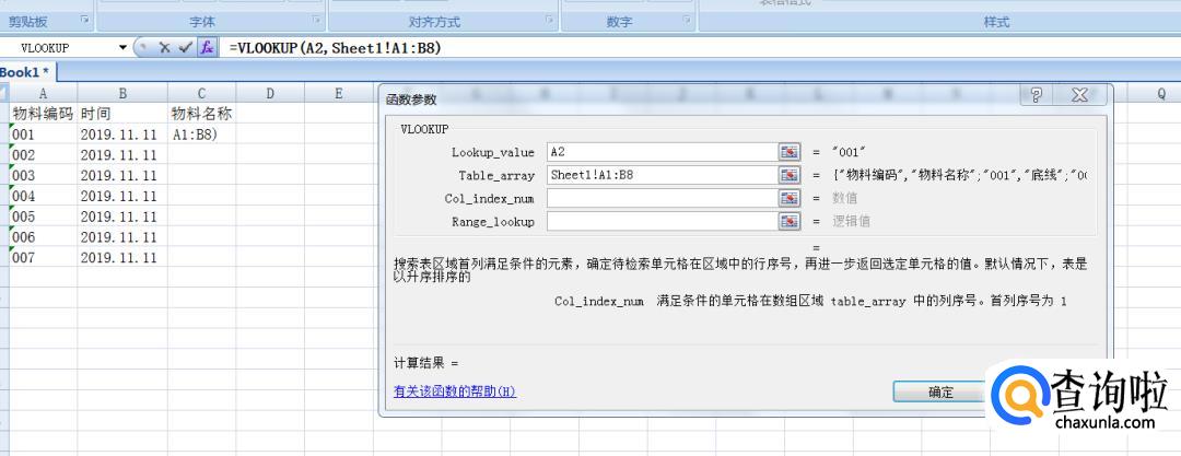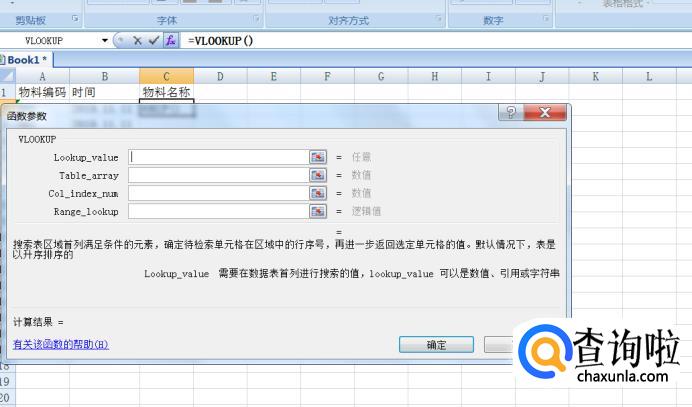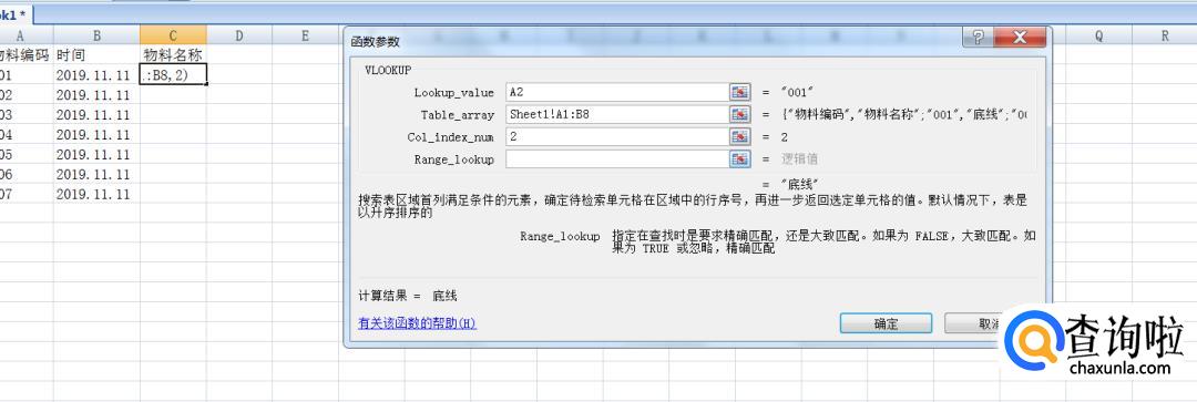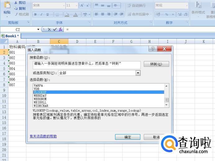 现在【SheetB】表中,点击【物料名称】列选中第一个空格,插入函数选择【vlookup】进行插入并确定。