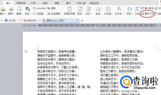 然后点击“插入”菜单,可以看到“首字下沉”,点击“首字下沉”即弹出“首字下沉”的对话框。